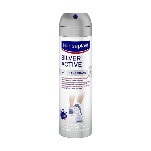 A Hansaplast Silver Active lábspray hosszan tartó (48 órás) védelmet nyújt a kellemetlen lábszag kialakulása ellen és felfrissíti a lábakat. A termék ezüst ion hatóanyaga erős gombaölő hatással rendelkezik, még kis mennyiségben is, és csökkenti a baktériumok elszaporodását, mely a lábszag kialakulásának legfőbb oka.